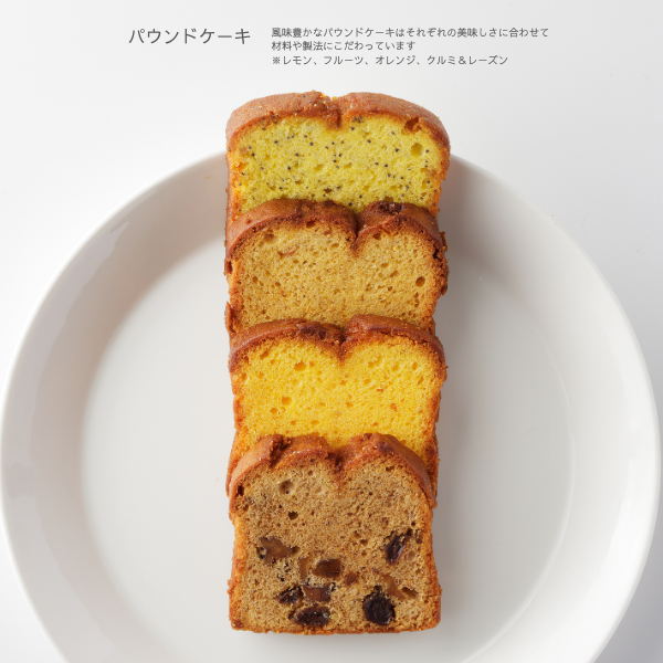 良質な小麦粉、国産バターに卵と砂糖、厳選した素材を基本にそれぞれの焼き菓子にシェフのおいしいエッセンスを加えました。